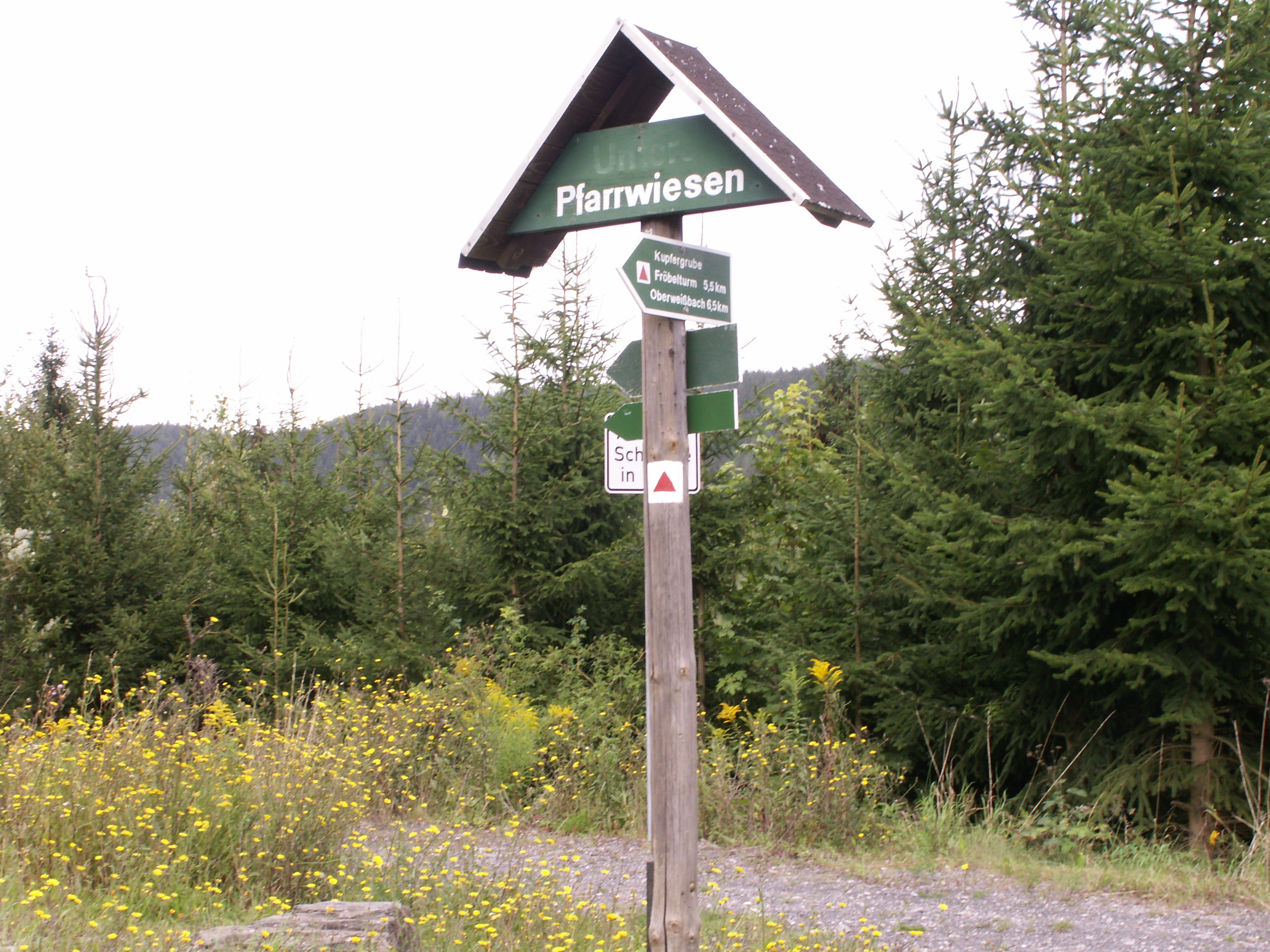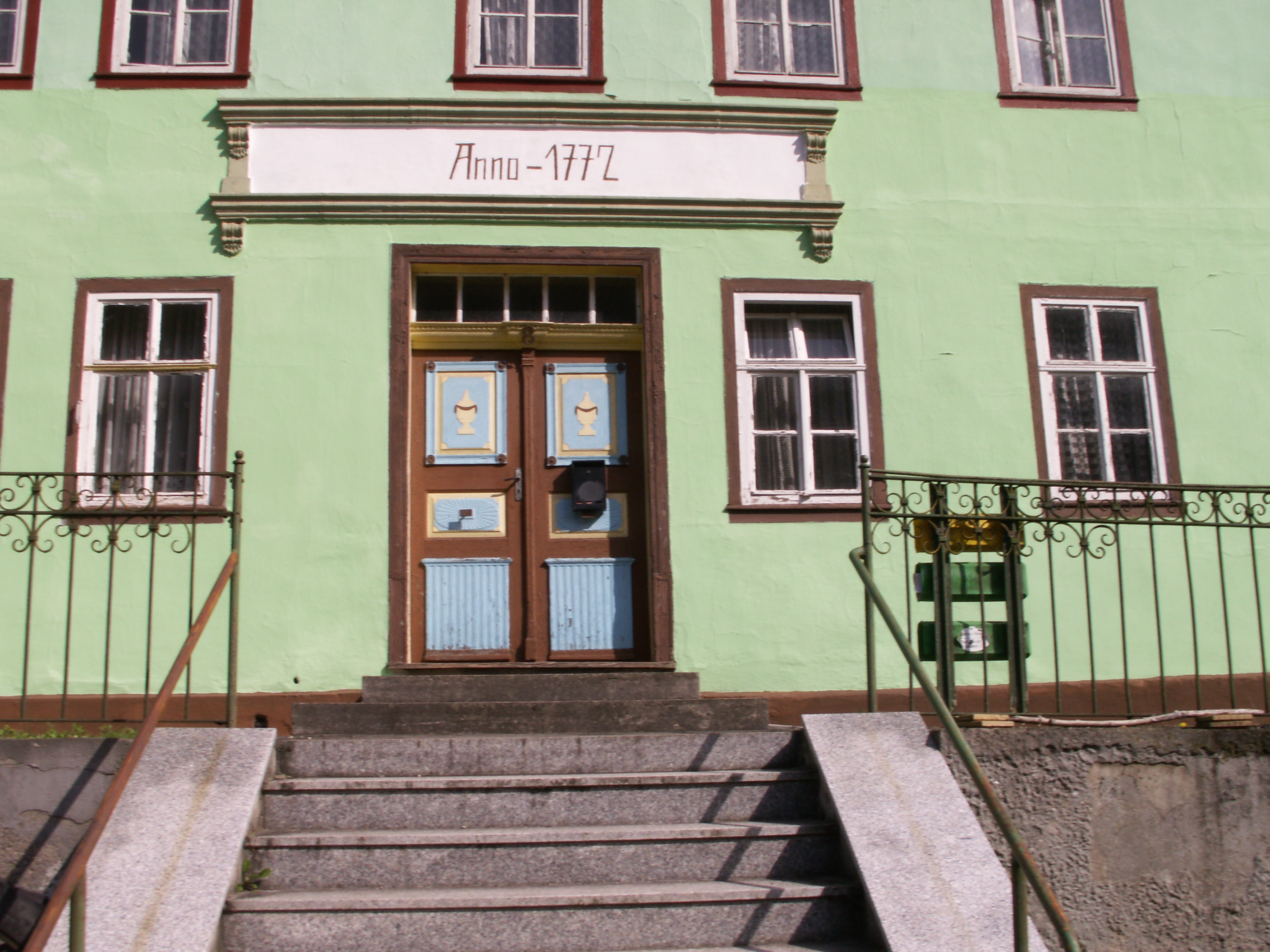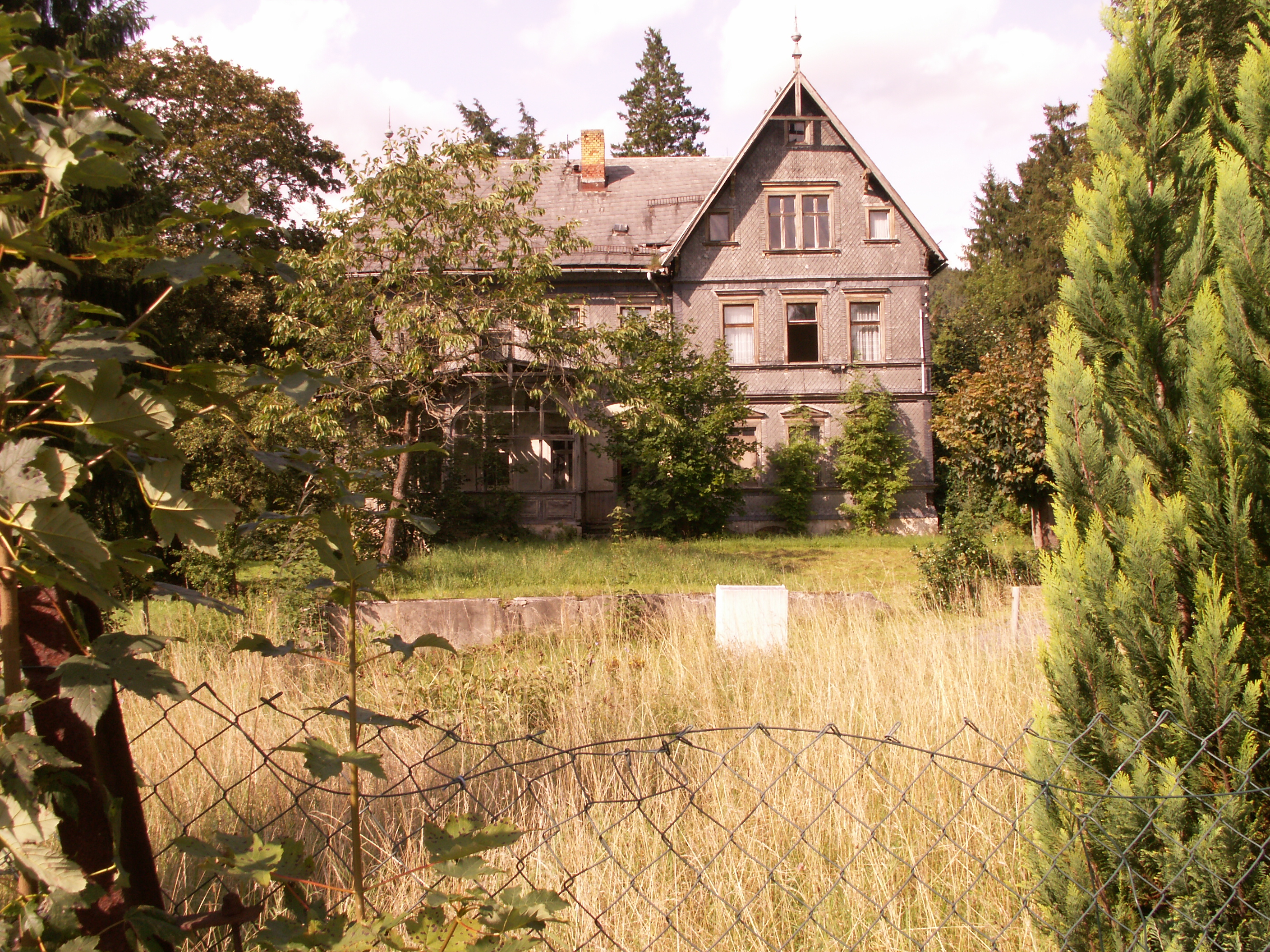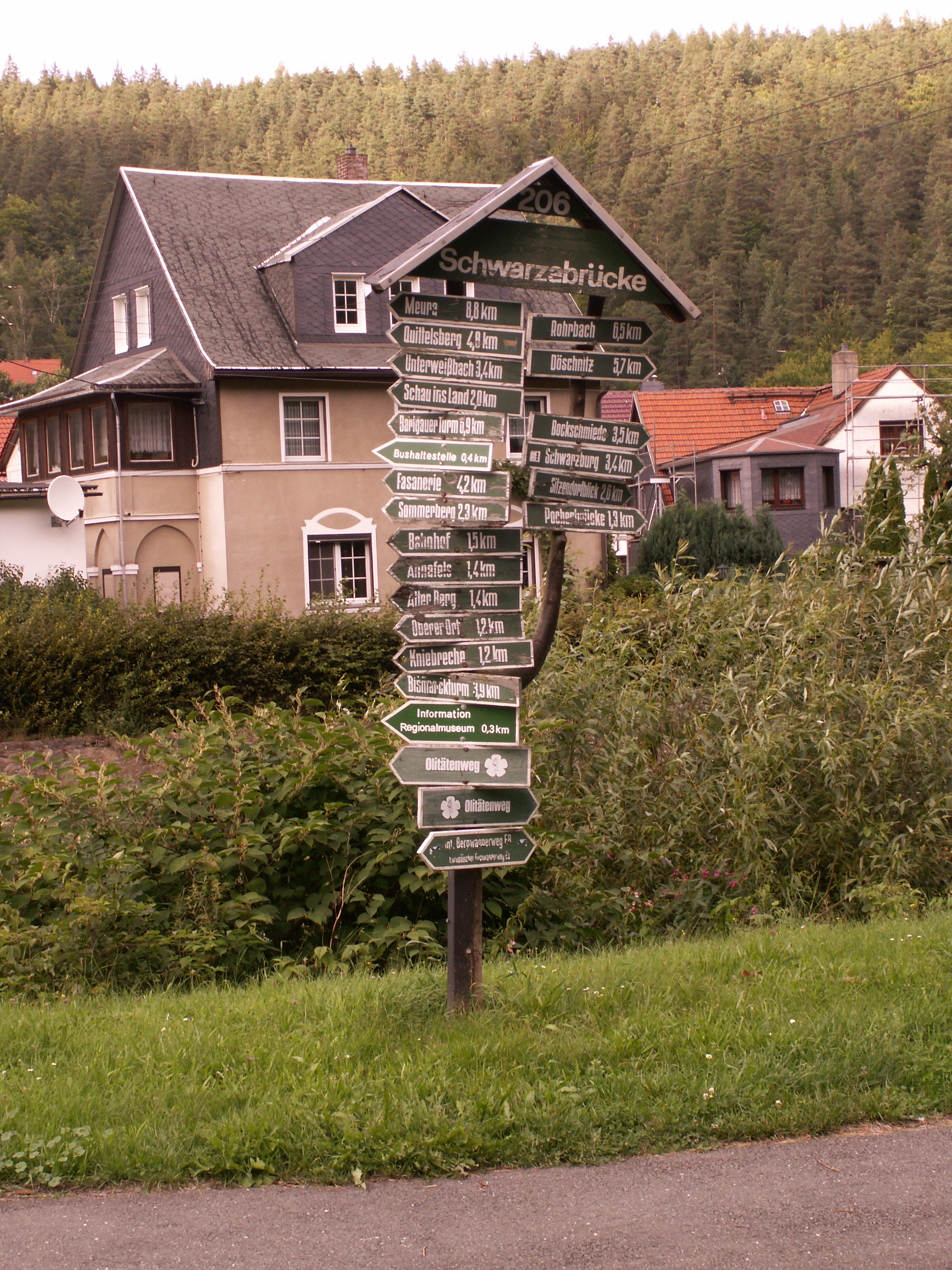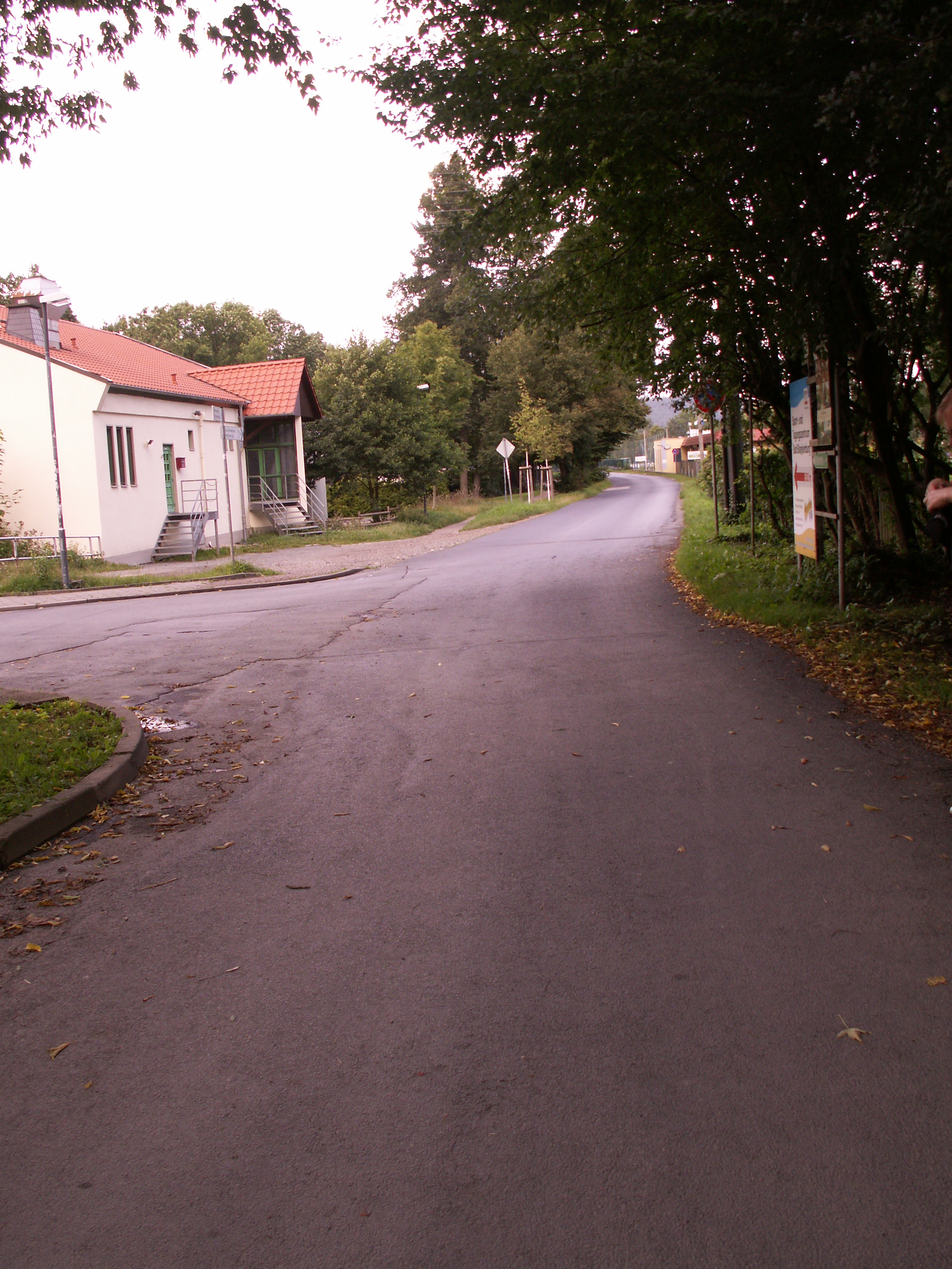 In Unterweißbach, das Dorf unterhalb der Staumauer/Talsperre Leibis-Lichte, kamen wir in der Ortsmitte auf der anderen Seite des Gasthofs mit dem Hirsch heraus. Das nächste Dorf war: Sitzendorf. Kaputte Häuser aber: mit Freibad. 😀