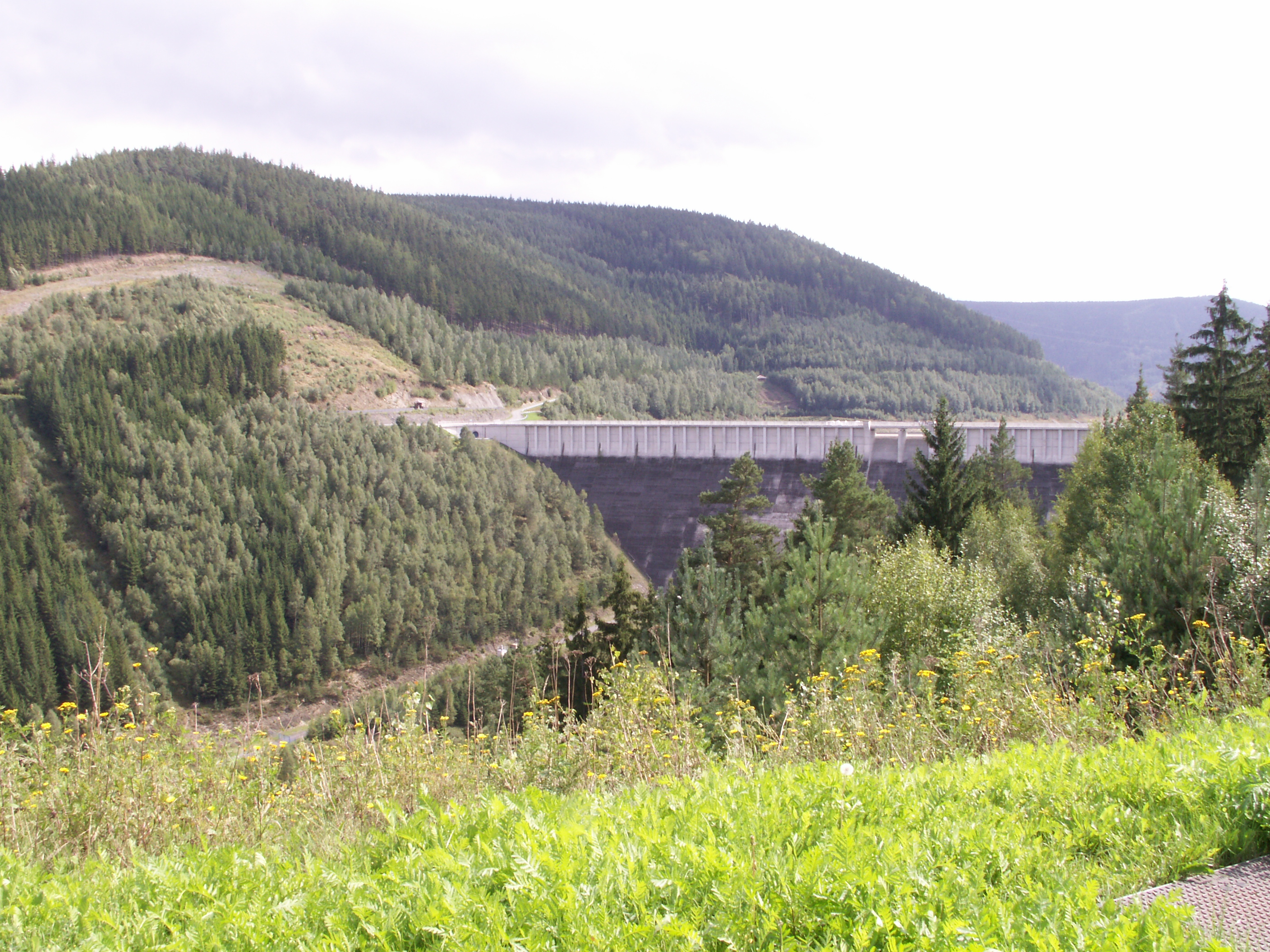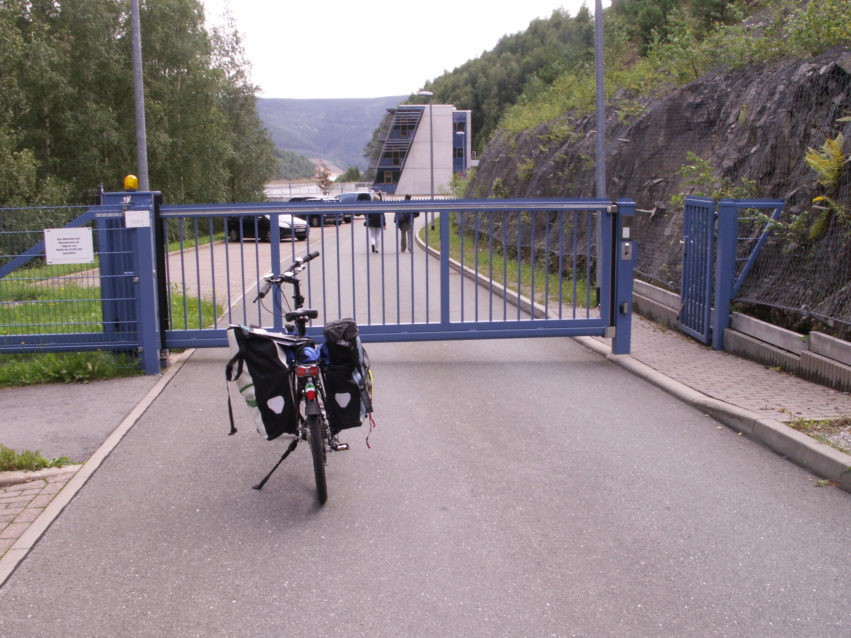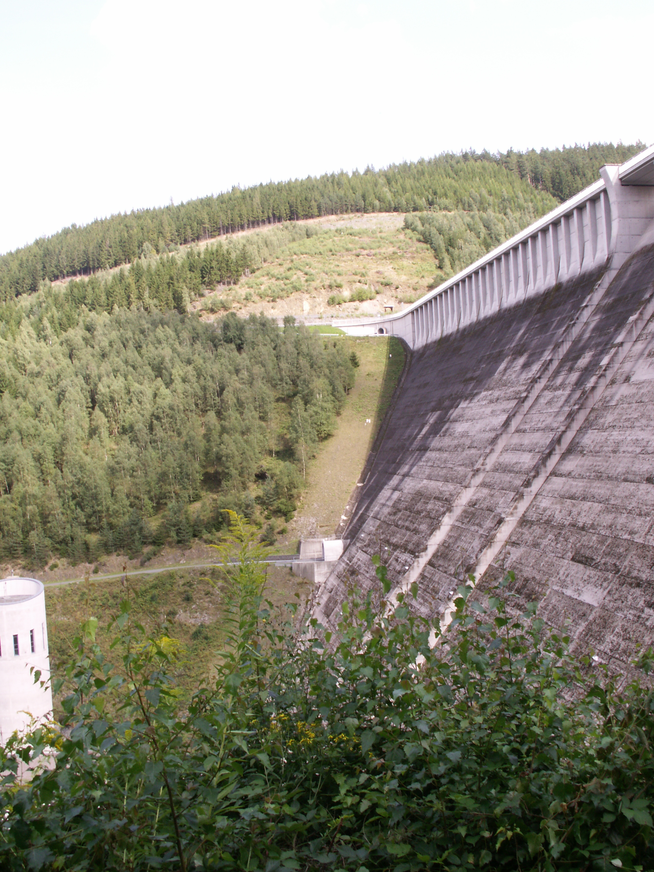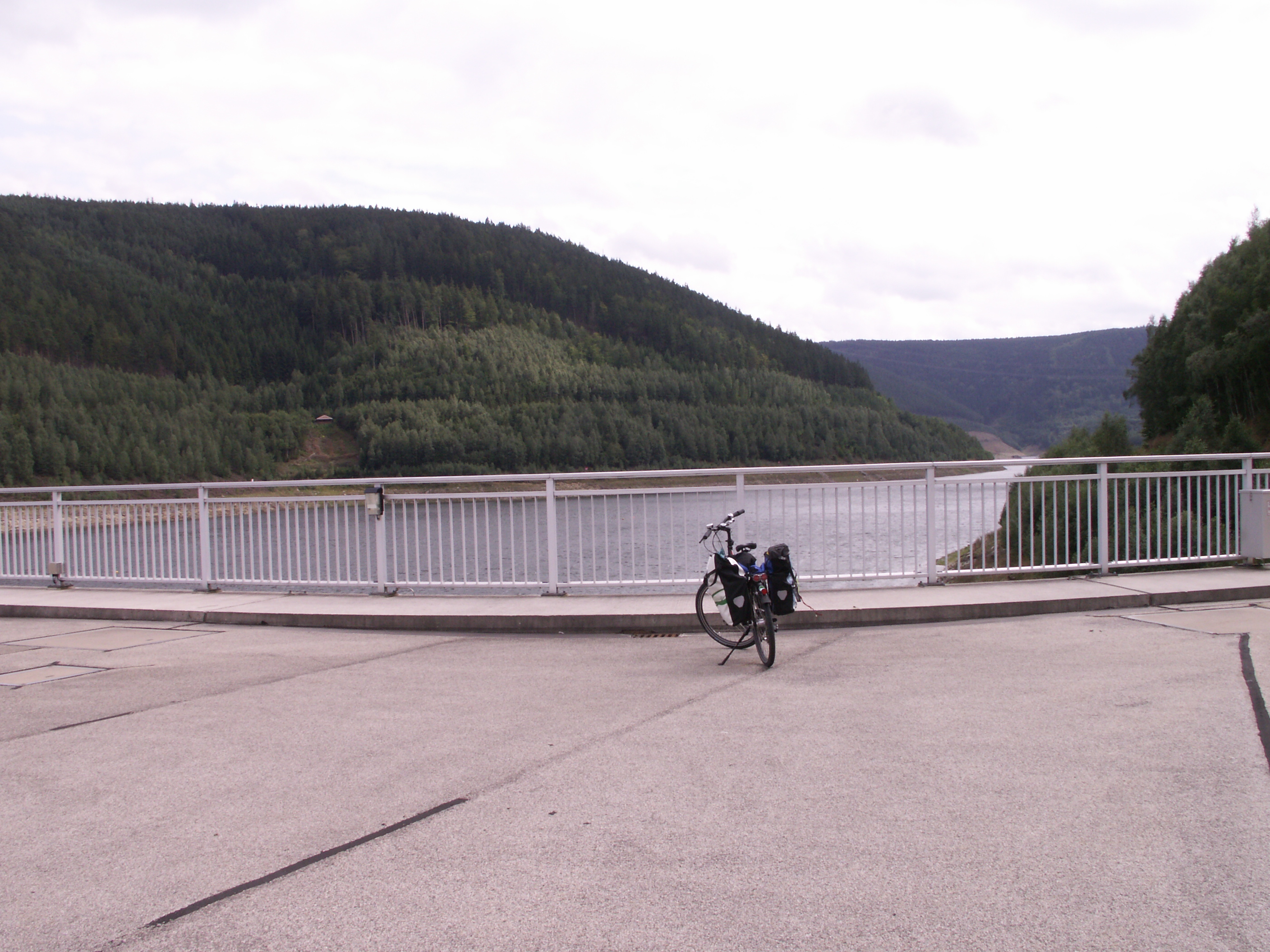 Endlich oben! Von Unterweißbach aus hatten wir einen Abstecher zur STaumauer gemacht: Talsperre Leibis-Lichte. Hier wird der Fluß Lichte zusammen mit anderen Gewässern gestaut. (Anstieg etwa 2km lang).