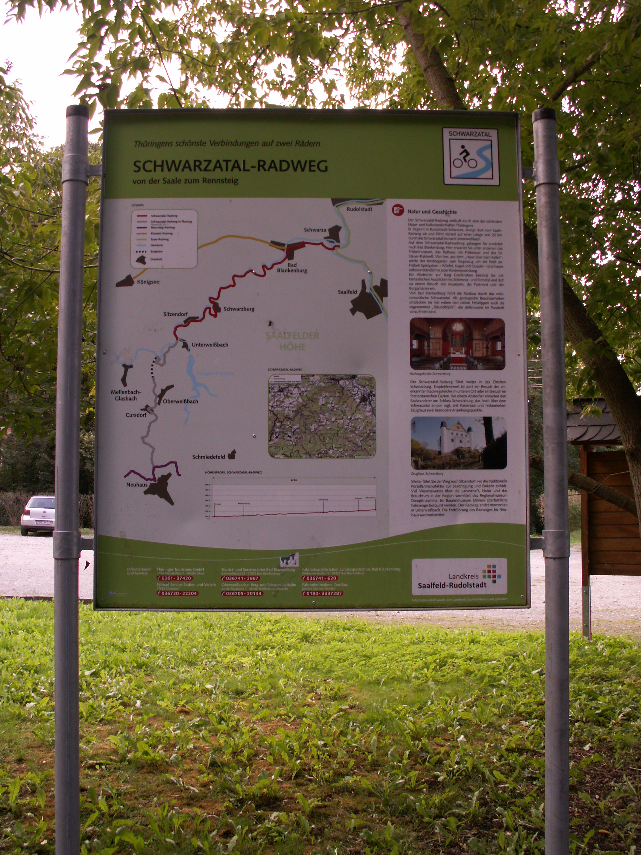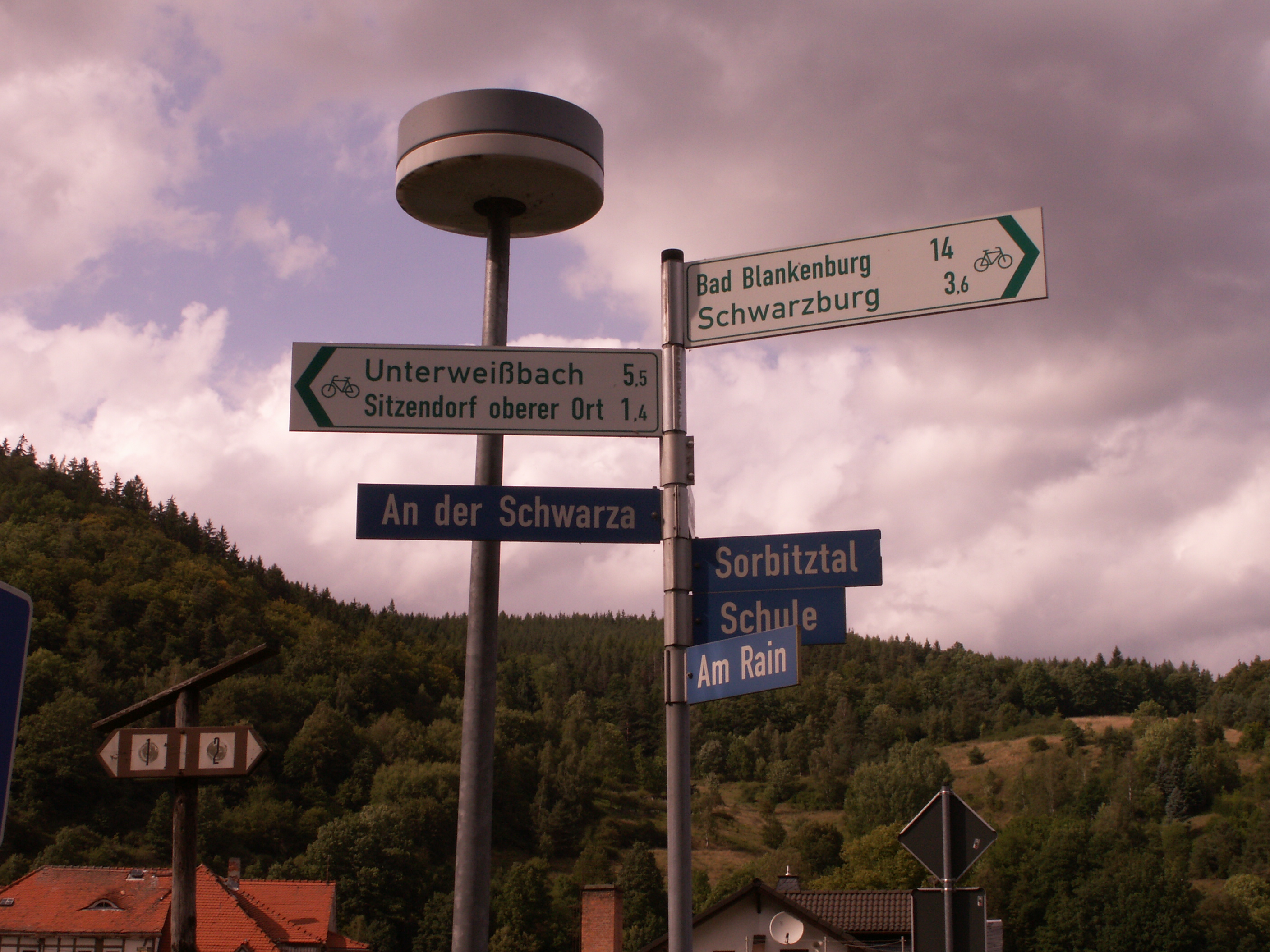 Tip, wenn man in Rudolstadt angekommen ist: nicht rechts abbiegen wie ausgeschildert (grüner Wegweiser auf weißem Grund), sondern geradeaus ins Wohngebiet auf den neuen gemeinsamen Rad- und Fußweg... dann mal die Bahnhofstraße rein – aber nicht ganz hinter! – sondern dann links in die Friedrich-Engels-Straße. Man landet auf einem Getränkemarktparkplatz. Gegenüber (über die Straße) davon ist der unscheinbare Eingang zum Bahnhof Rudolstadt-Schwarza (milchig-weiße Schallschutzwände mit türkis-blauen Streifen).