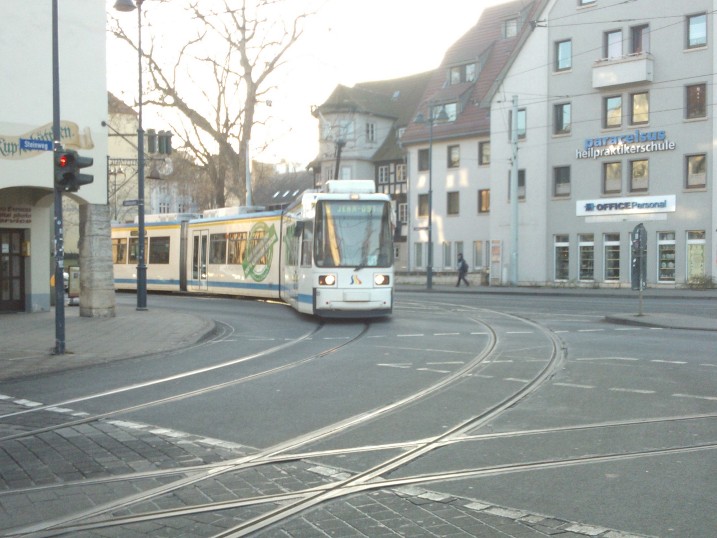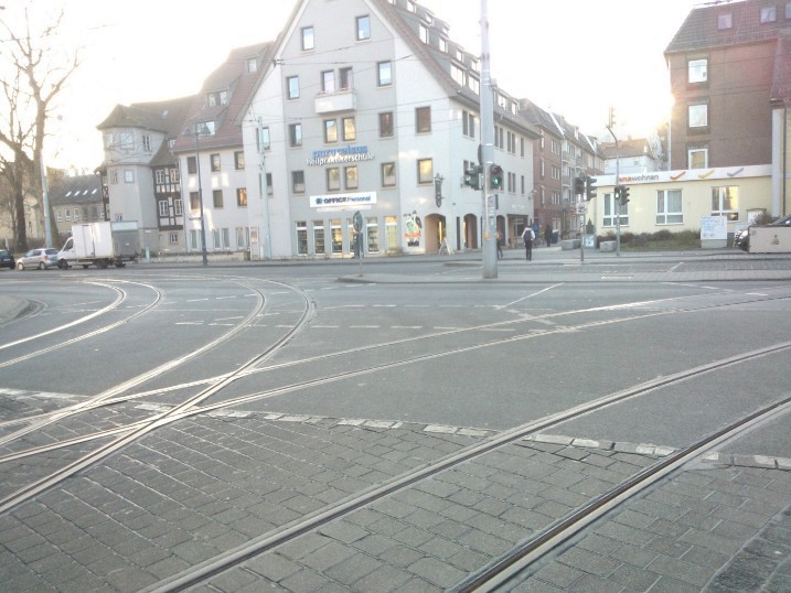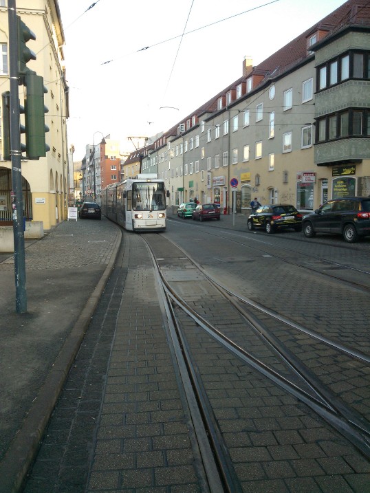 Außerdem steigt die Oberfläche des Steinwegs zur Mitte hin leicht an. Das mag wegen starker Regengüsse so geplant worden sein, damit das Wasser in die Gullys am Bordstein laufen kann. ABER FÜR RADLER BEDEUTET DIE LEICHT ABSCHÜSSIGE EBENE ZUM STRASSENRAND HIN EINEN SCHLINGERKURS FAHREN ZU MÜSSEN. Vor allem bei Regen ist es furchtbar, dort entlang zu fahren! Man fährt unfreiwillig in einer leichten, aber doch stark fahrbaren Mulde, diese Mulde ist zwischen der äußeren Straßenbahnschiene und dem Bordstein. Dazu kommt noch die ständig drohende Vertiefung der Schiene. In Nürnberg bin ich mit meinem Vorderrad schon mal in eine Straßenbahnschiene geraten. Es war abends gegen 18.30 Uhr, Winterhalbjahr, also schon dunkel. Glücklicherweise kam grad keine Straßenbahn.
