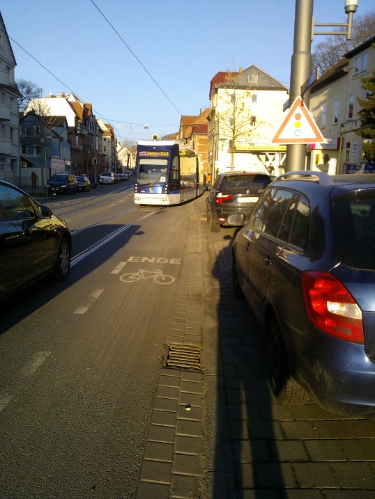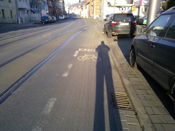 Der Radfahrstreifen hört plötzlich auf. Noch dazu an der Stelle, an der die Straßenbahn nur noch eingleisig verkehrt. Ganz toll. Dass es dort nicht öfter mal kracht…. ein Wunder wäre es nicht.