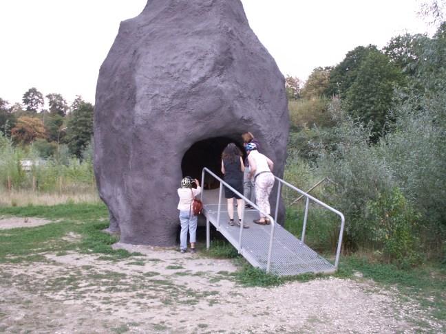 Ein rätselhaftes Kunstwerk.So wie es mitten in der Landschaft am Wegesrand von der Straße und Radweg steht, fällt der große Stein auf. Die Neugierde treibt die Besucherinnen und Besucher dann doch hinein in den goldenen Innenraum. Es ist überraschend und angenehm hell da drin. Licht, Wärme und Schutz soll den Leuten in der „kleinen Weile“, wie das Kunstwerk heißt, vermittelt werden. Durch die goldene Farbe und die Öffnung oben ist es erstaunlich hell da drin.Aber Wärme und Schutz habe ich da drin nicht empfunden. Es ist eher ein eher banges Gefühl, weil man nicht weiß, wo die Wand beginnt und der Boden und Grund aufhört. Ein jüngerer Besucher konnte einem Bahnradfahrer gleich im Kreis herumrennen. Die eigene Stimme klingen wie… im Weltraum, wie in einem Popsong, bei dem die menschliche Stimme elektronisch verzerrt klingt. Heimelig klingt das nciht. Kein Gefühl der Bedrohung oder Angst, ber auch kein heimeliges Gefühl. So bleibt man auch nur eine „kleine Weile“ in diesem Kunstwerk, bevor man wieder herausklettert.