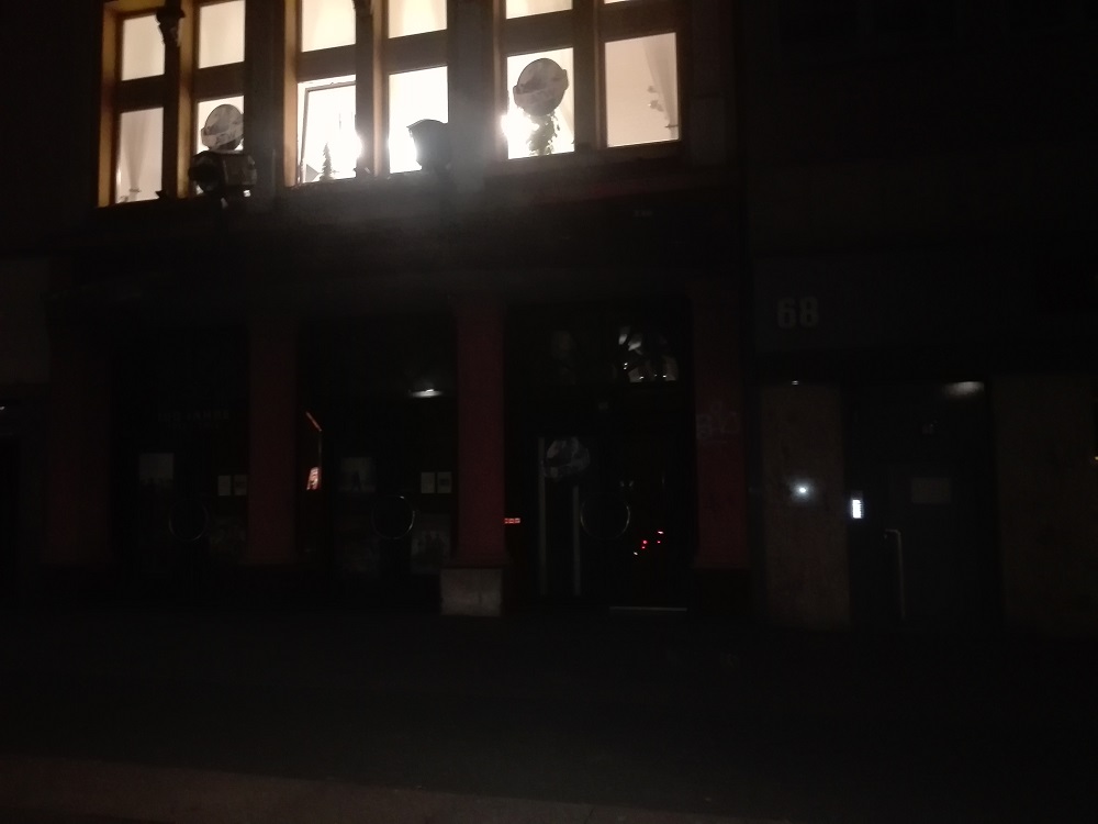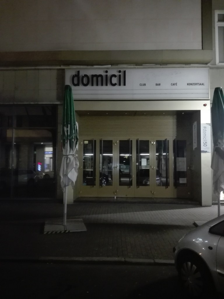 Ohne Beleuchtung und Beschriftung, leer und verlassen, wo sonst das Leben ist: der Jazzclub domicil während des Elends von Coronakrise. Eigenes Foto