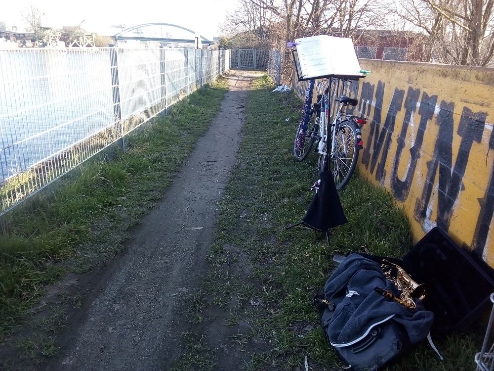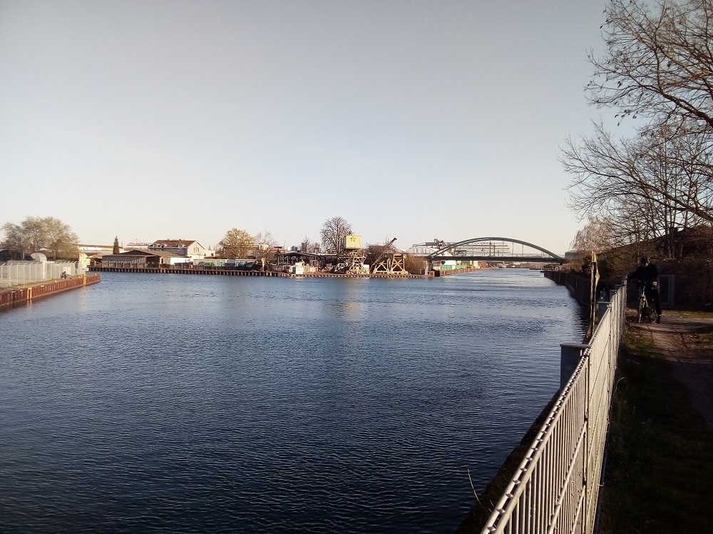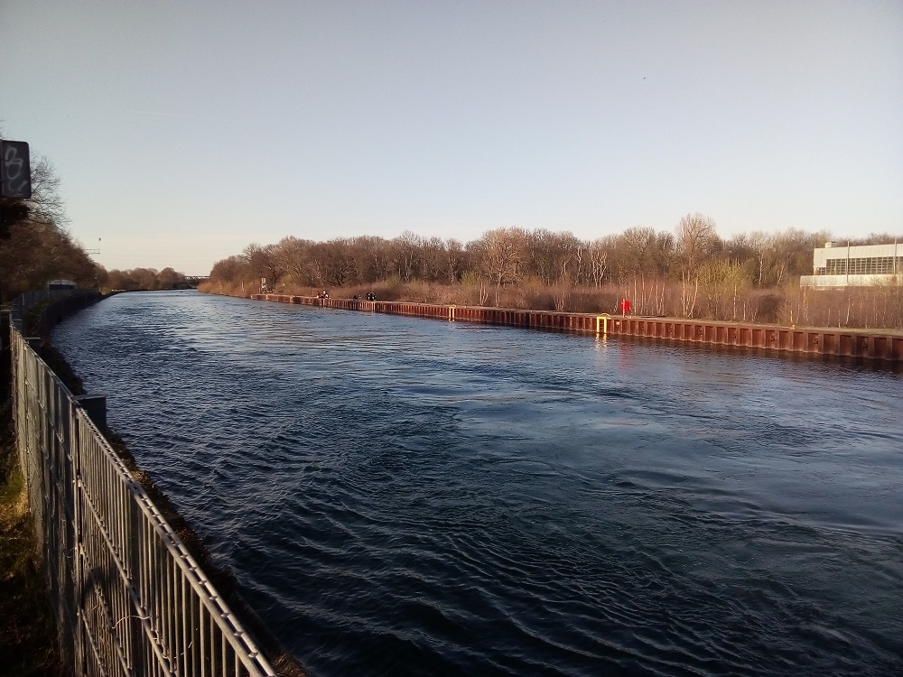 Das Wasser des Dortmund-Ems-Kanals rauscht nicht von allein. Große Schiffe, meistens Frachter oder der Wind erzeugen Wellen, deren Rauschen man hört. Gelegentlich hört man ein „Platsch“ an sonnigen Tagen, wenn Menschen in den Kanal zum Baden springen. Ist eigentlich nicht erlaubt, aber wohl doch so erfrischend, dass man es immer wieder tut. (Ihren Abfall sollten die Badegäste aber bitte wieder mitnehmen! Und die Hafenverwaltung sollte mehr Mülleimer aufstellen). An diesem sonnigen Montag, den 29. März 2021 hört man außerdem Spaziergänger*innen am Kanal, wie sie plaudern, lachen, manche haben Musikboxen angeschaltet. Vom Hafen hört man Maschinengebrumm. In einem Garten nahe des Kanalweges hört man immer wieder jemand rufen, ob die Frau nach einem Tier oder Menschen ruft, ist unklar.