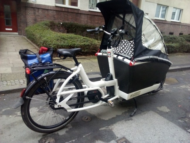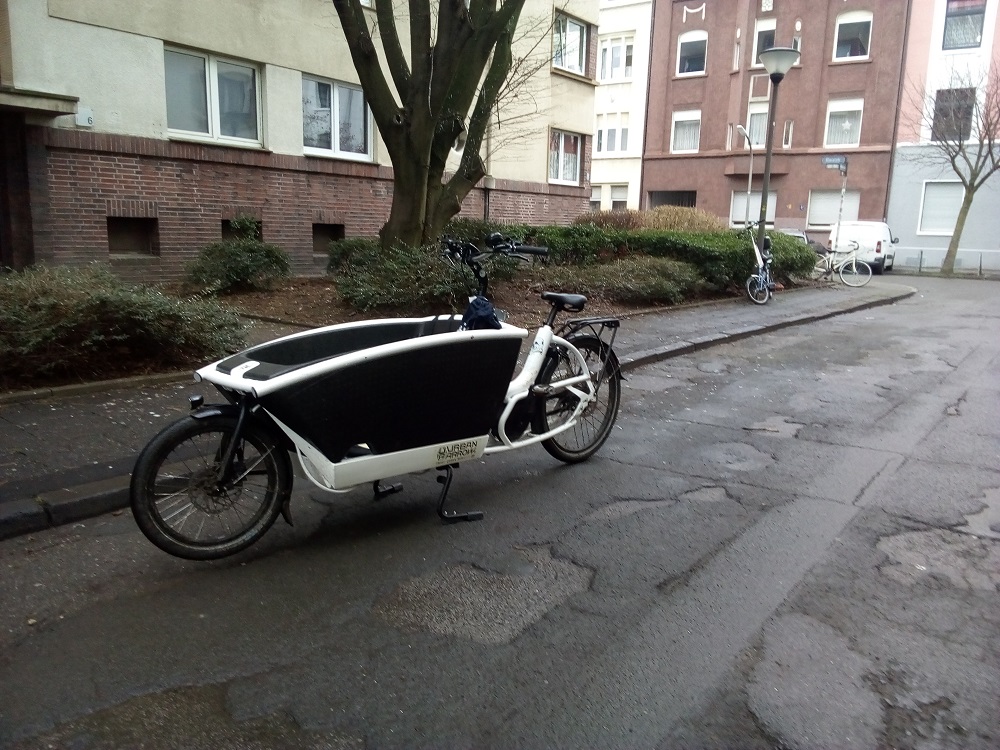 Manchmal hat man Glück. Manchmal meldet sich jemand, wenn man etwas sucht. In einer Critical-Mass-Gruppe hatte ich gefragt, ob jemand in meiner Stadt auch ein Lastenrad mit E-Motorenunterstützung verleihen könnte. Und siehe da, es meldete sich jemand. GErda wohnt ja in Gelsenkirchen, der „verbotenen“ Stadt, der Weg dorthin ist für die Ausleihe schon immer weiter und langwieriger. Die Ausleihe in meiner Wahl-Heimatstadt bot die Möglichkeit, ein weiteres Modell, das ich noch nicht kannte, auszuprobieren.