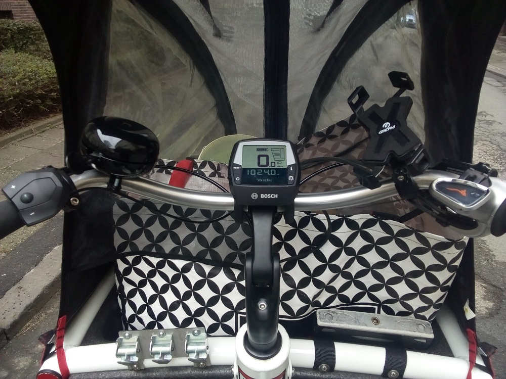 Der Bordcomputer ist an sich übersichtlich gestaltet. Was mich aber immer verwirrt, ist die Einstellung der Unterstützung in die verschiedenen Stufen Eco, Tour, EMTB, Turbo. Im Gegensatz zum kleinen Display am Packster 60 muss man beim Urban Arrow auf der linken Lenkerseite die gewünschte Stufe drücken. An der Ampel anfahren… huch, warum geht das plötzlich so schwer? Hatte ich doch versehentlich den Motor ausgeschalten! 😉 Oder: hui, warum plötzlich die Sport-Unterstützung? Eine Sache, woran ich mich immer wieder gewöhnen muss. Nach der ersten Fahrt weiß ich aber wieder: Vorsicht beim linken Lenkergriff…. und es läuft ohne falsche Motoreinstellungen.