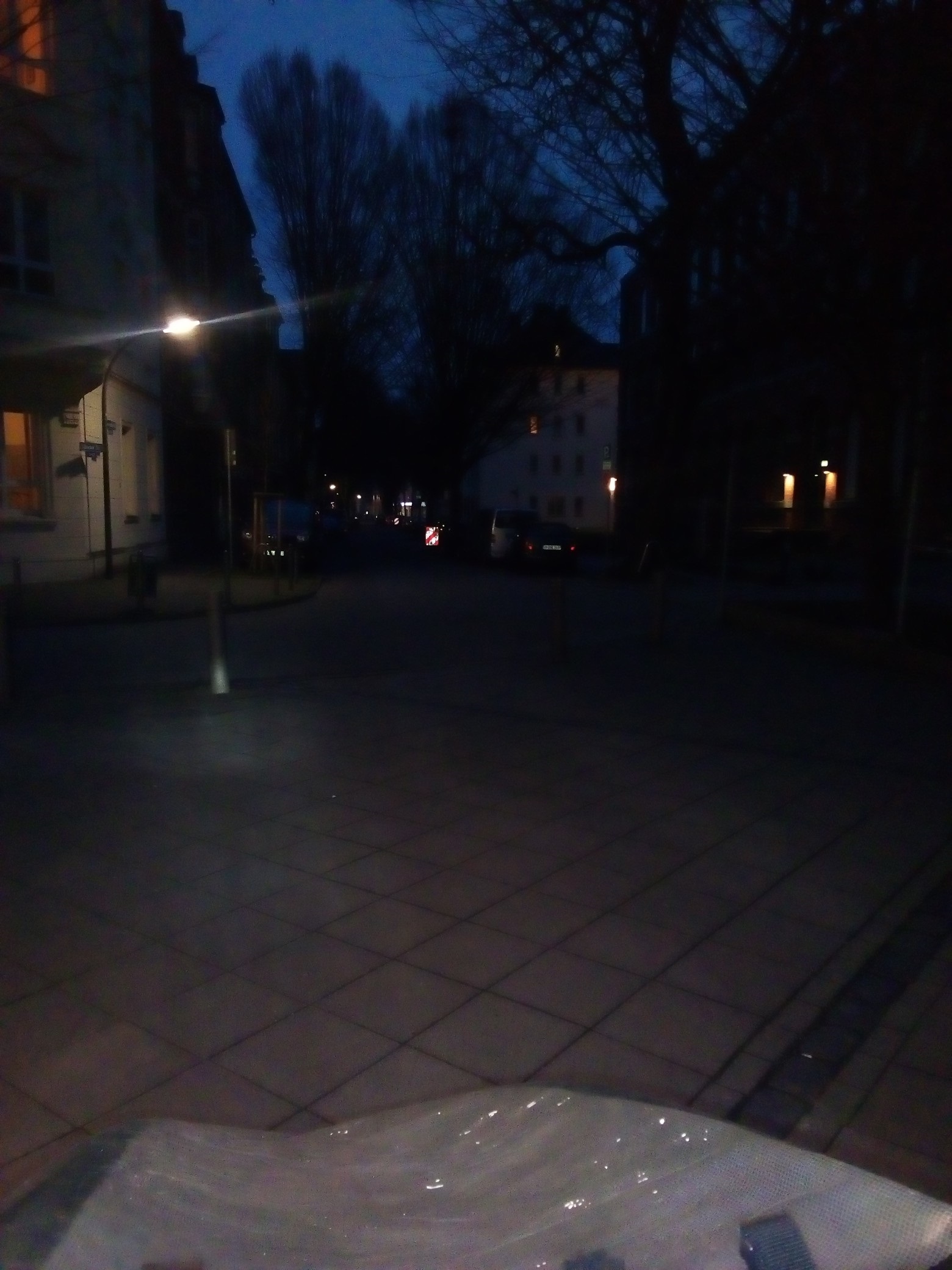 Nach Mitternacht sind nie viele Menschen unterwegs, außer vielleicht am Wochenende, wenn es keine beschissene Corona-Pandemie gibt. Durch die weißen, gefrorenen Kristalle sind es noch weniger. An der Kreuzung Brinkhoffstraße standen Fahrzeuge der Stadtverwaltung: die Straße wäre vereist und würde deshalb abgesperrt. Die ganze Szene wirkte leicht skurril. Ich musste ohnehin schieben. An einfach den Berg hinunter in die Schützenstraße rollen, davon konnte nicht die Rede sein.