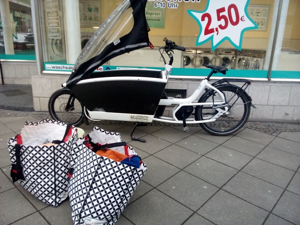 Da ich leider kein Geld für eine neue Waschmaschine habe, die alte hat wohl die letzten beiden Umzüge nicht überlebt, ist die Lastenradausleihe für mich sehr wichtig. Durch die eingeschränkten Ausleihzeiten bin ich oft in Eile, muss zusehen, daß ich rechtzeitig beim Waschsalon bin, die Wäsche möglichst mit dem Lastenrad nach Hause bringe, um dann das Leihfahrzeug zum 2-3 km entfernten Verleiher zu bringen. Oft genug, auch ausgelöst durch andere ungute Umstände (Mattigkeit durch die Periode, Erschöpfung durch die Verdienstarbeit), musste ich nach Abgabe der NOLA die zwei dicken großen Taschen mit der nassen Wäsche mit dem normalen Rad nach Hause schieben. Auch bei nur 2-3 Kilometern eine Schinderei.