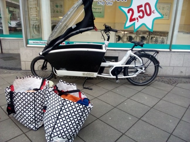 Auch vollgeladen ließ sich das Urban Arrow super fahren. Kein Gewackel, kein Murren. Die „Wanne“ ist tief, so passte alles schön rein. Thema Dreistigkeit: als ich im Waschsalon die zweite Tasche mit der gewaschenen Wäsche holte, musste tatsächlich eine Passantin in die Ladefläche glotzen, das Regendach war ja offen. Nur gut, dass ich die erste Tasche schon vor das Lastenrad gestellt hatte, so dass es unmöglich war, einfach in die Ladefläche zu fassen! Gekaufte Lebensmittel zu stehlen… sollte eigentlich hierzulande nicht notwendig sein. Aber Deppen, die es unbedingt tun müssen, gibt es immer. Ein strenger Blick durch die Scheibe und mein baldiges Auftauchen draußen vor dem Waschsalon genügte, dass sich diese Frau verziehen musste.