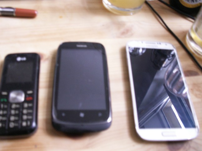 Das Smartphone im Frühjahr 2015 war (und ist noch) ein Nokia Lumia 610 (Mitte im Bild). Günstig von einem Freund bekommen, 30€, das paßt erst mal, dachte ich. Es hat ein angenehmes Design, das die Augen nicht überfordert; man kann die Kacheln auf dem Eröffnungs-Bildschirm in verschiedenen Farben einstellen, blau erschien mir am angenehmsten. Unterwegs auch mal E-mails lesen, weniger verpassen, gleich antworten können… keine schlechte Sache! Allerdings ist das Leben auch stressiger geworden. Es ist nicht so einfach den Drang zu unterdrücken, alle paar Minuten oder jede Viertelstunde mal nachzusehen, ob es was Neues gibt. (Gut, inzwischen mehr als früher, als der Reiz des Neuen noch größer gewesen war). Zuerst wurden eben nur 2x am Tag E-Mails beantwortet, wenn ich eben an einem Rechner saß. Manches nervt; bei anderen Sachen ist es gut, wenn man gleich antworten kann.