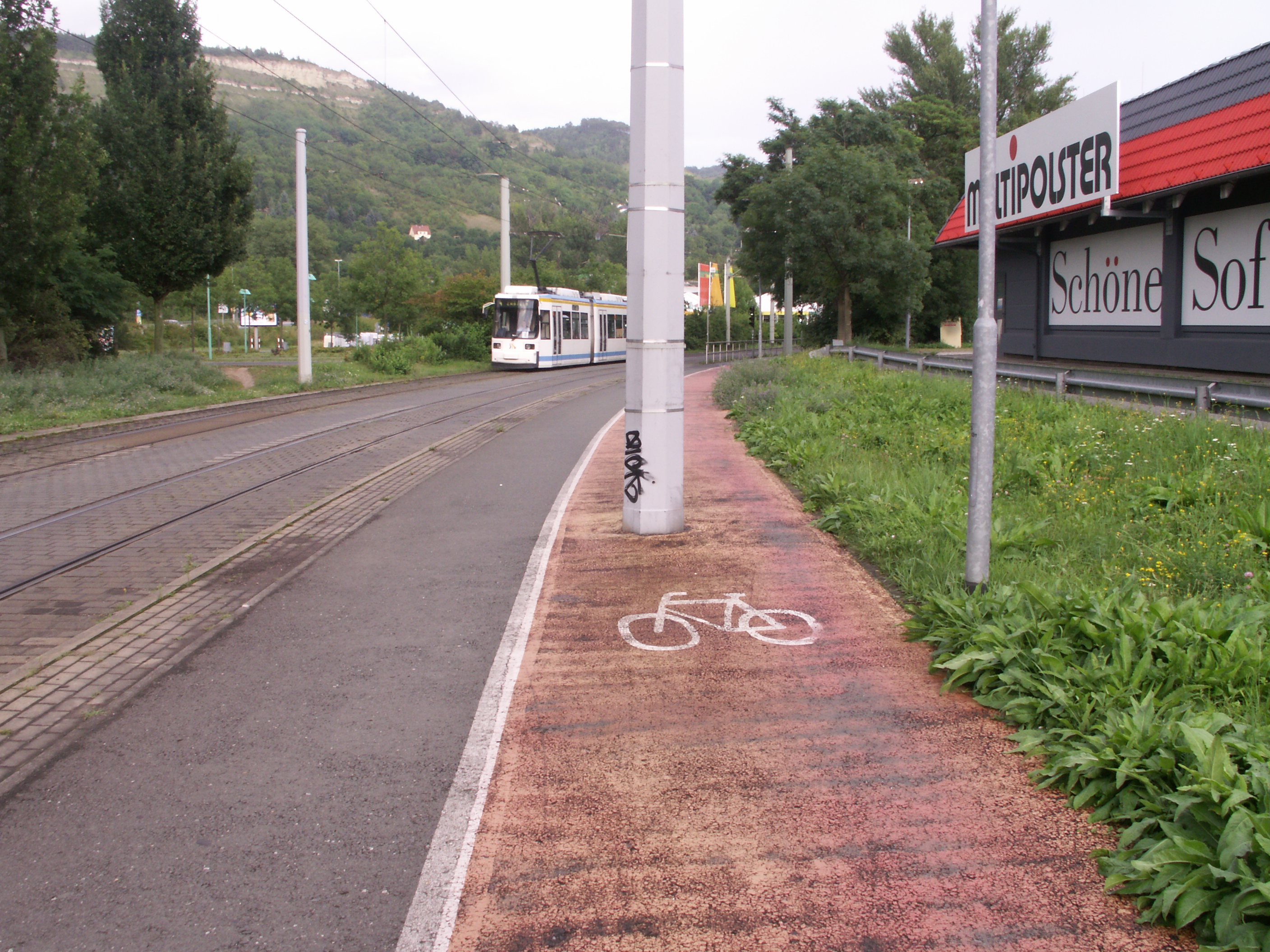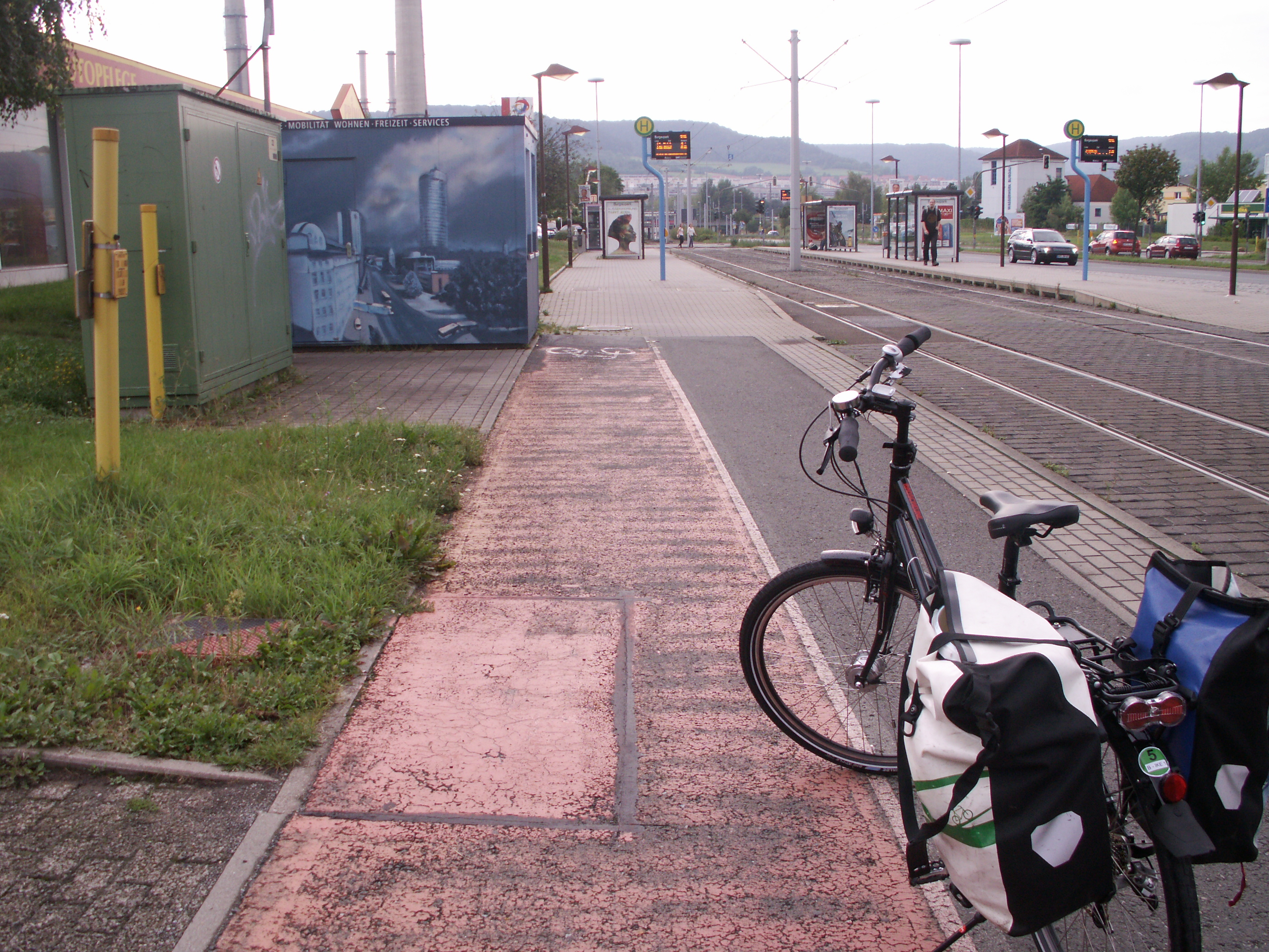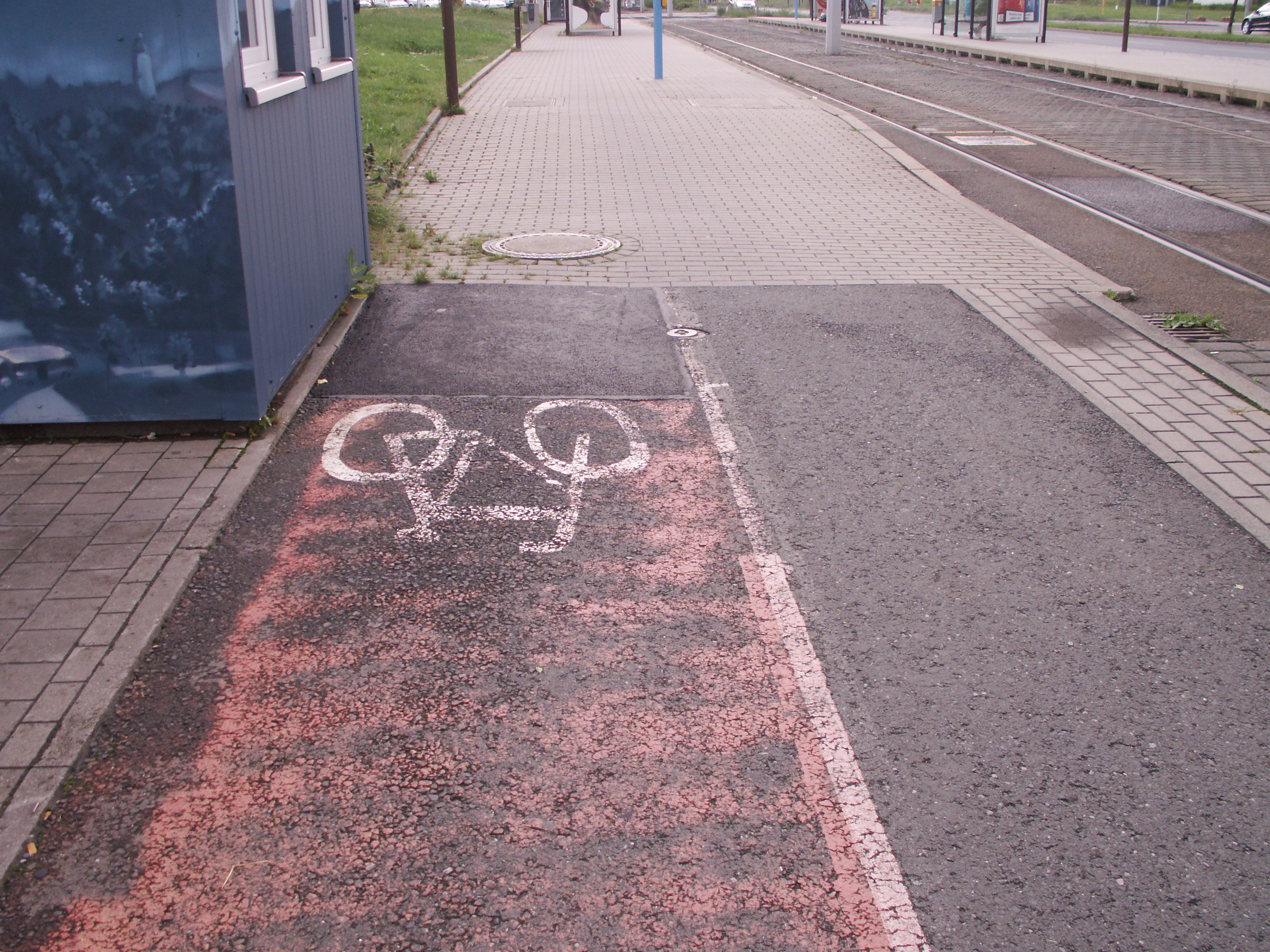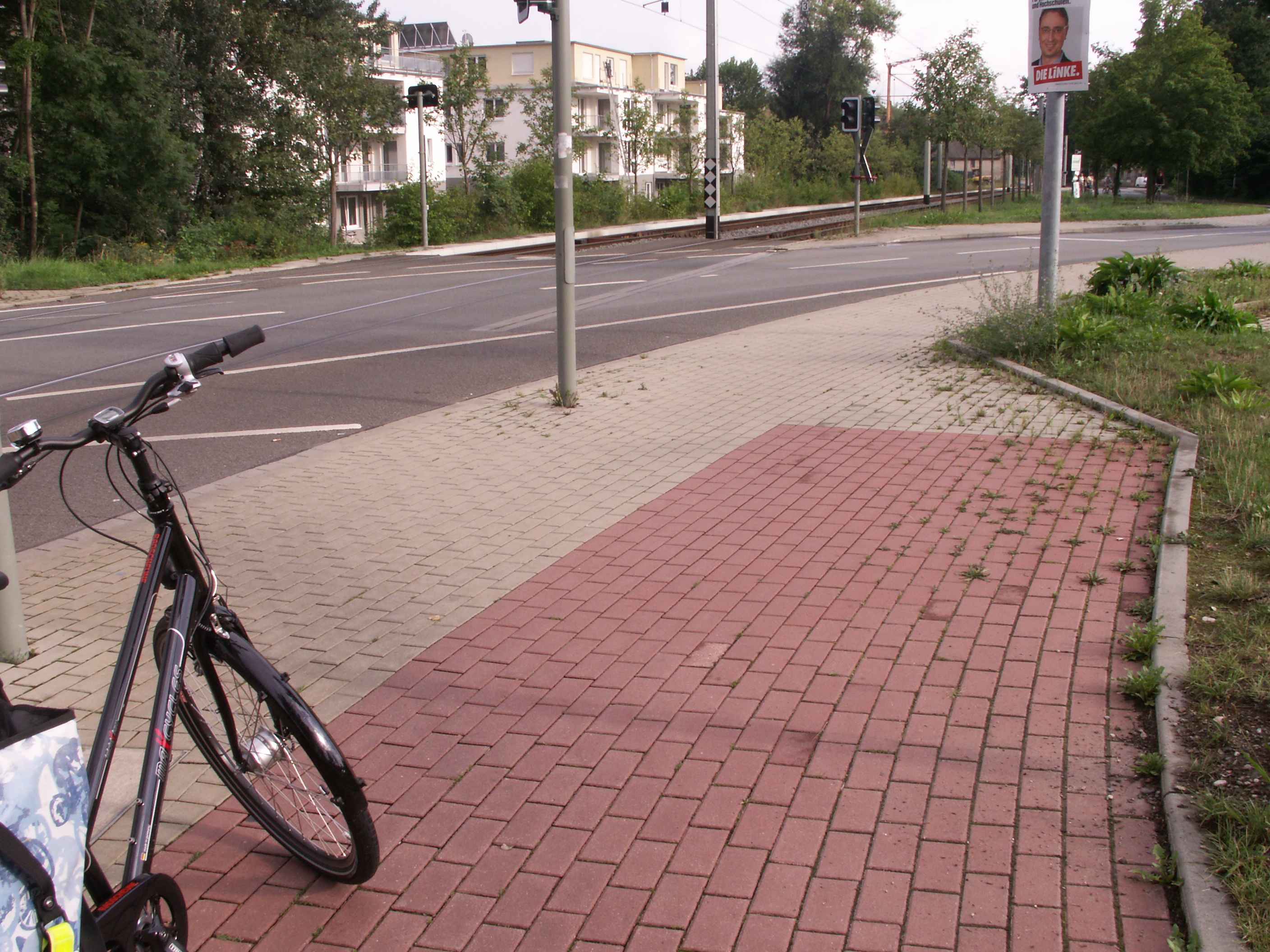 Bedauerlich allerdings, dass es praktisch keine Zufahrt zur Ausleihstation gibt. Warum? Es kann doch nicht die Lösung sein, solch ein breites Rad auf dem Gehweg, der auch zu schmal ist (weil die heiligen Parkplätze nie, niemals wegfallen dürfen), von und zur Station zu bewegen! Fastg übersieht man die Station, weil man nur Blech sieht, das davor steht.